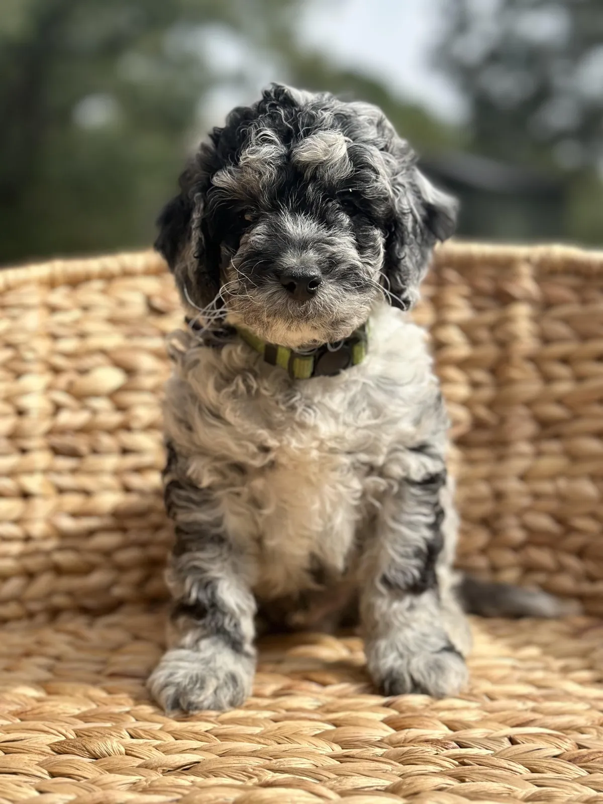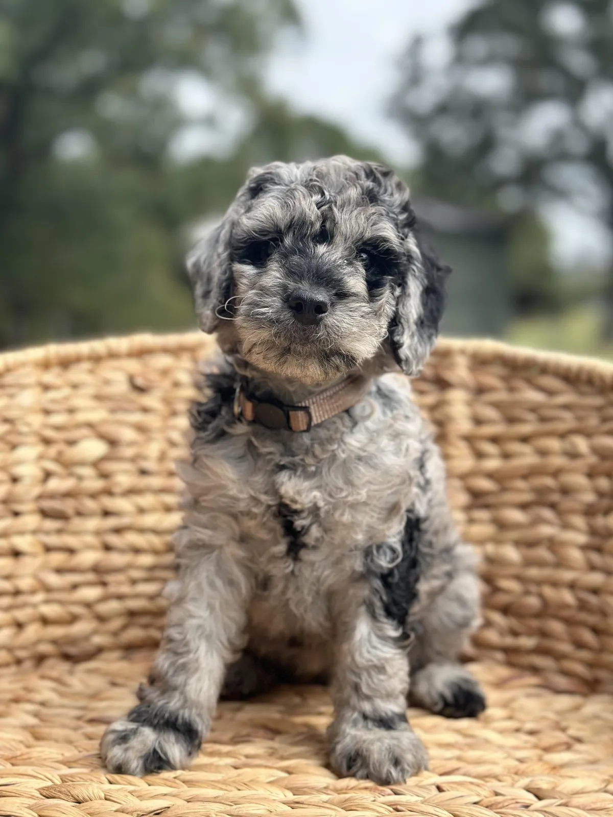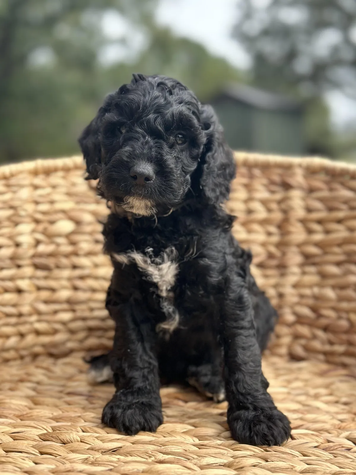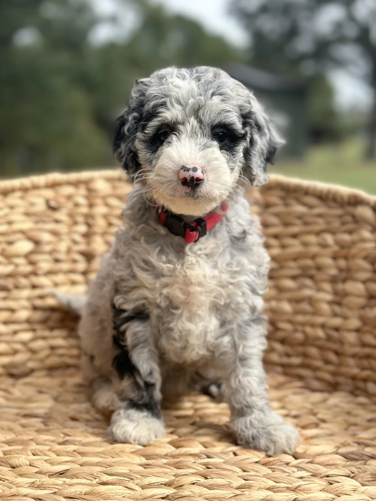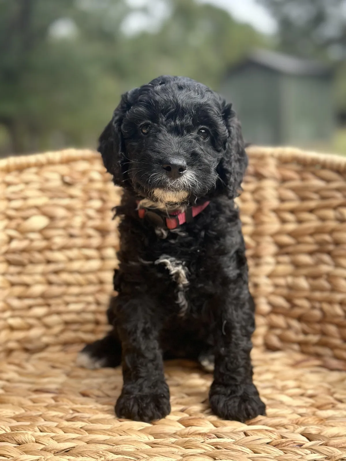 An F1BB Mini Bernedoodle is a cross between a Bernese Mountain Dog (12.5%) and a Miniature Poodle (87.5%). Mini Bernedoodles are known to be gentle, loving, and loyal. They are very affectionate and friendly towards all people, making them great family dogs. The puppies will weigh under 30 lbs full grown and will have curly, non-shedding coats.