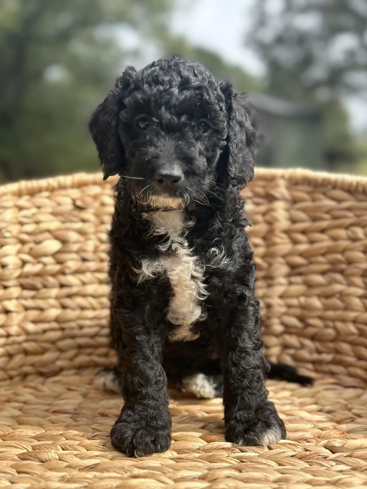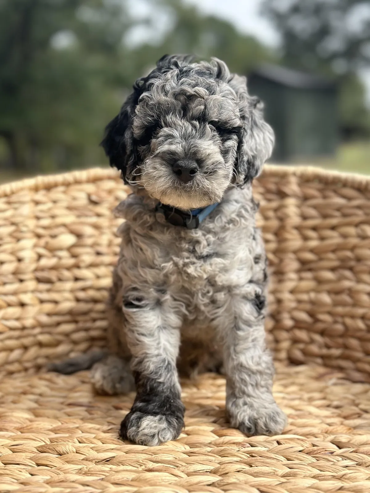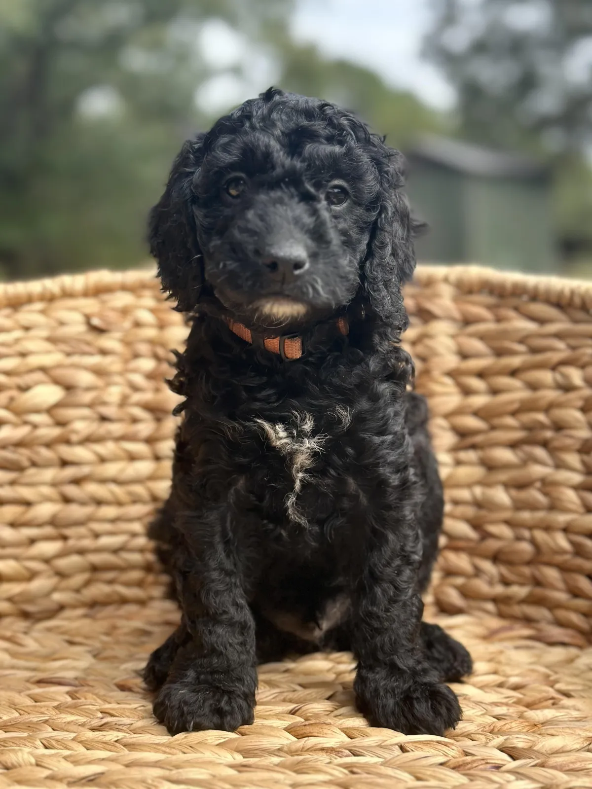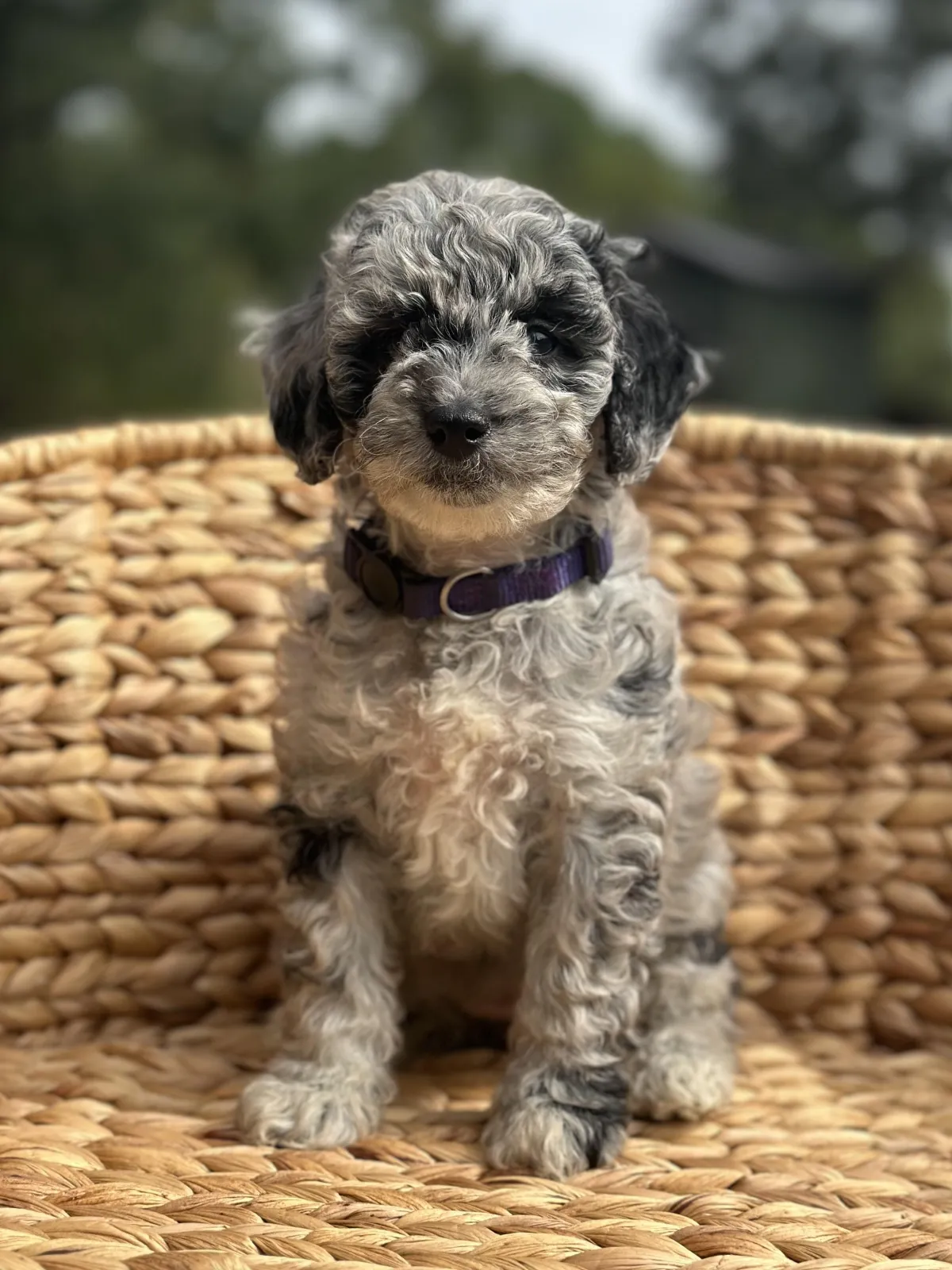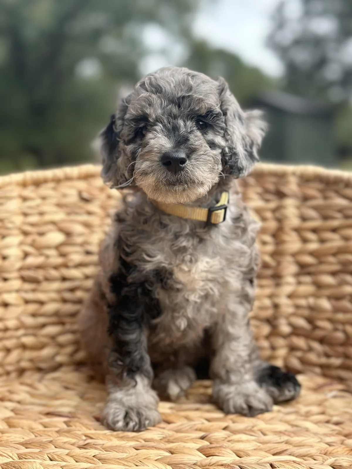 An F1BB Mini Bernedoodle is a cross between a Bernese Mountain Dog (12.5%) and a Miniature Poodle (87.5%). Mini Bernedoodles are known to be gentle, loving, and loyal. They are very affectionate and friendly towards all people, making them great family dogs. The puppies will weigh under 30 lbs full grown and will have curly, non-shedding coats.